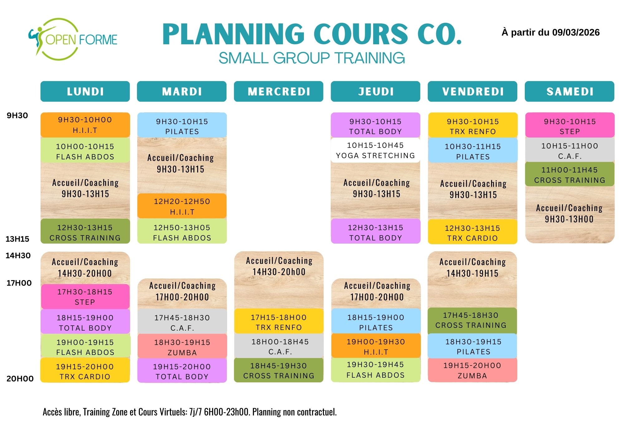 Open forme est une salle de sport composée de différents espaces pour du cardio-training, renforcement musculaire, entrainement fonctionnel, cours collectifs en petit groupe (Small Group Training), coaching sportif et nutrition, cours virtuels 7j/7.