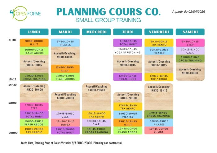 Le coach pense chaque séance en fonction du nombre de participants et de leur profil (pensez à réserver !) Il prépare des ateliers variés, sous forme de circuit, que chacun effectuera sur un temps chronométré. Chaque participant peut adapter le nombre de répétition et l’intensité de l’exercice en fonction de sa condition physique.